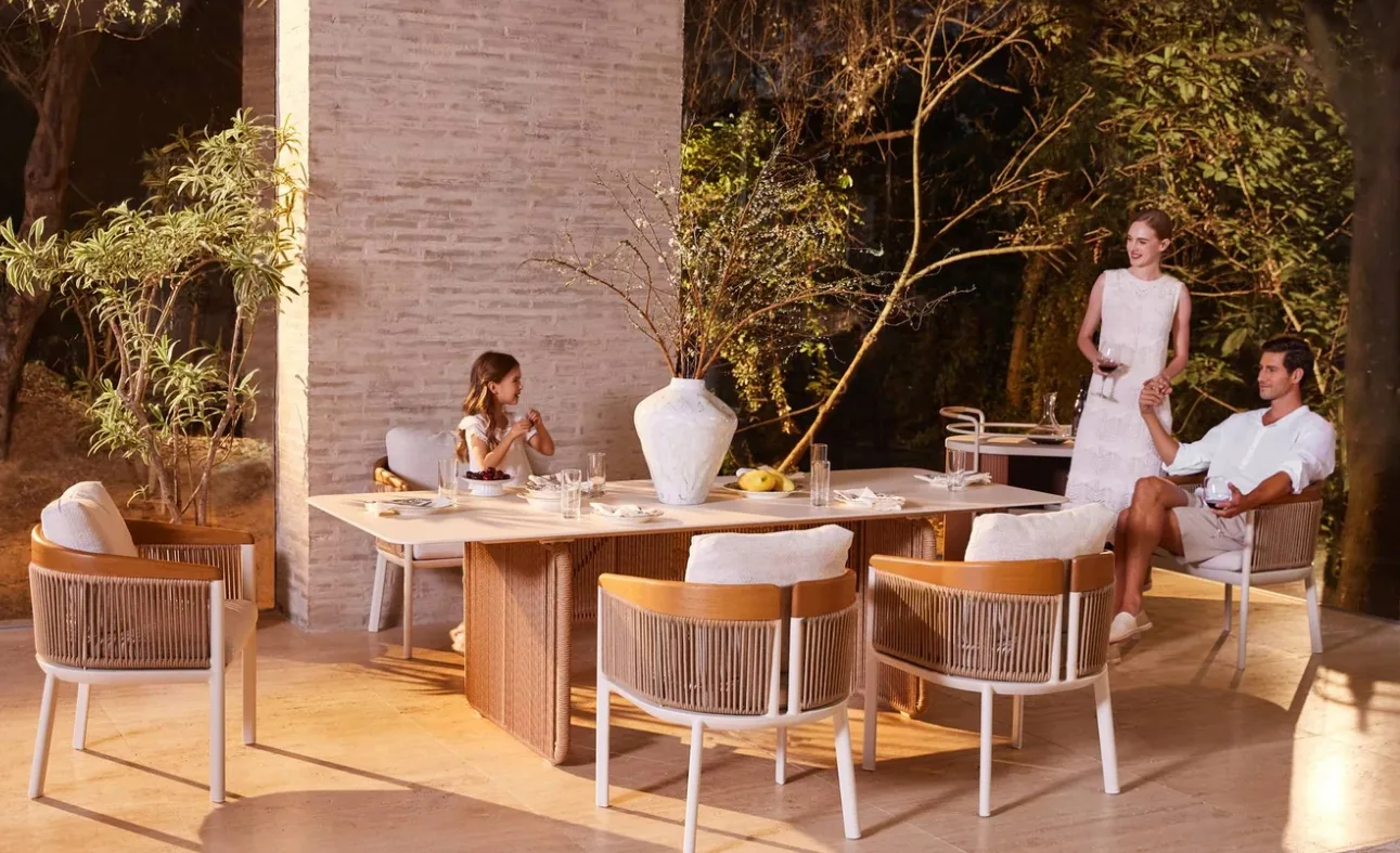 A Bienno kültéri étkezőasztal a modern kültéri étkezőterek elegáns és időtálló központi eleme, amely a természetes anyagok melegségét és a prémium design letisztultságát ötvözi. Ideális választás teraszra, kertbe vagy exkluzív vendéglátóhelyek számára.