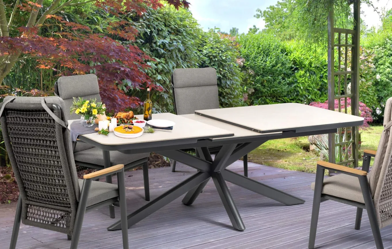 Tökéletes választás, ha egy elegáns, bővíthető és rendkívül tartós étkezőasztalt keresel, amely a terasz vagy kert meghatározó központi eleme lesz.