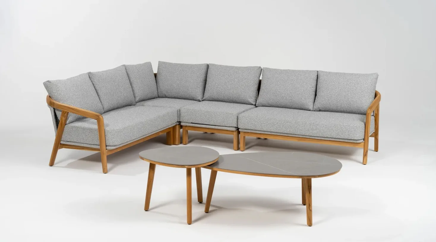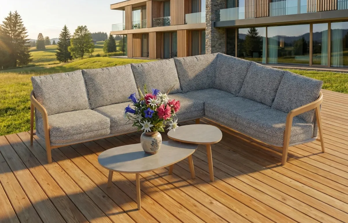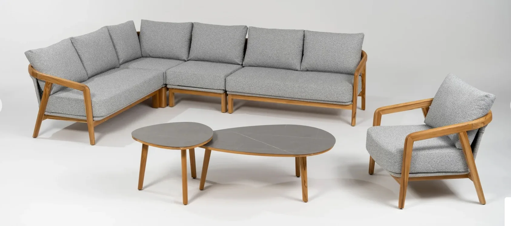 A Brasilia szett kialakítását a letisztult vonalak és a fa hatású elemek kombinációja teszi különlegessé. A világos párnák és a minimalista formák elegáns, mégis barátságos összhatást teremtenek, amely könnyedén illeszkedik modern kültéri környezetbe.
