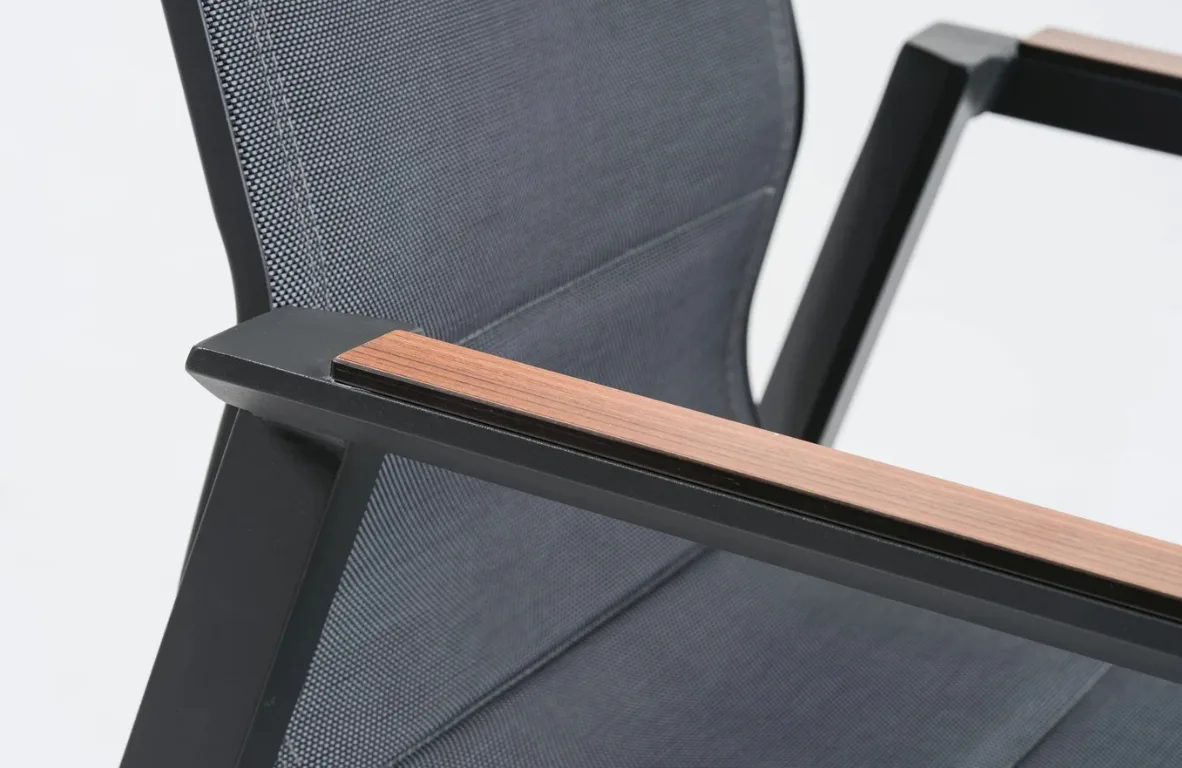 Az antracit színű alumínium váz és a textilén ülő- és háttámla elegáns, visszafogott megjelenést biztosít. A fa hatású karfa részletek melegséget visznek az összképbe, így a bárszék könnyedén illeszkedik különböző kültéri környezetekhez.
