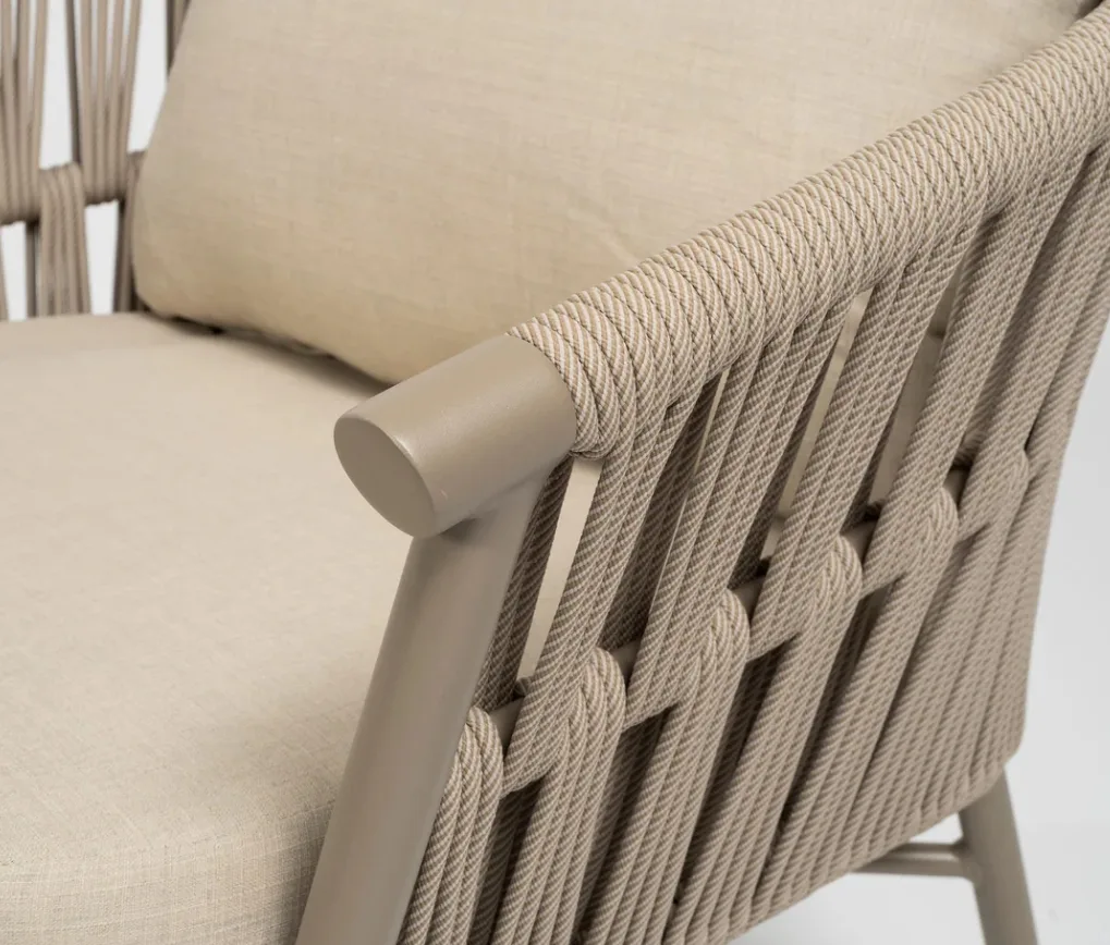 Modern és harmonikus design: a bézs melírozott textilszálak és a taupe alumínium váz természetes, ugyanakkor letisztult megjelenést biztosítanak a kültéri térnek.