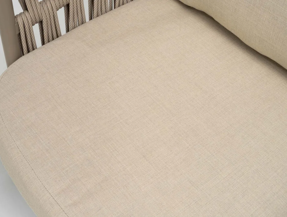 A Fan ülőgarnitúra stabil alumínium vázzal készült, amely porfestett kivitelben ellenáll az időjárás viszontagságainak. A természetes és meleg tónusú bézs melírozott textilszálas részletek folyamatos, elegáns látványt nyújtanak, miközben a krém színű, vízlepergető párnák extra kényelmet biztosítanak a pihenéshez. A bútorok asztallapjai szintén időjárásálló alumíniumból készülnek, így hosszú távú kültéri használatra alkalmasak.