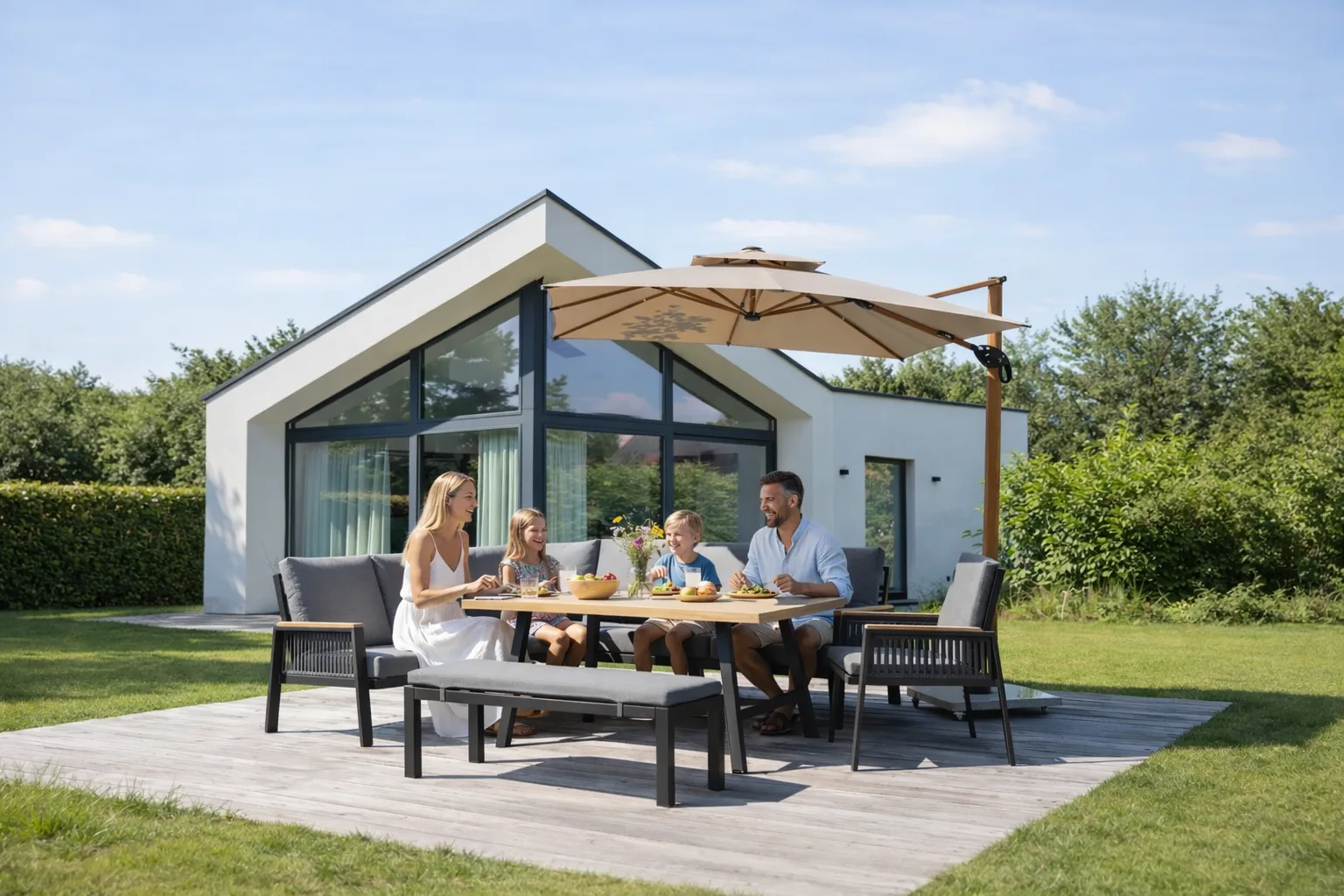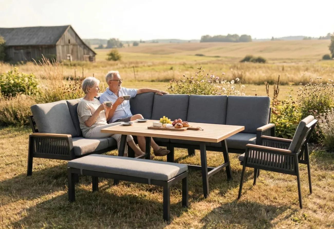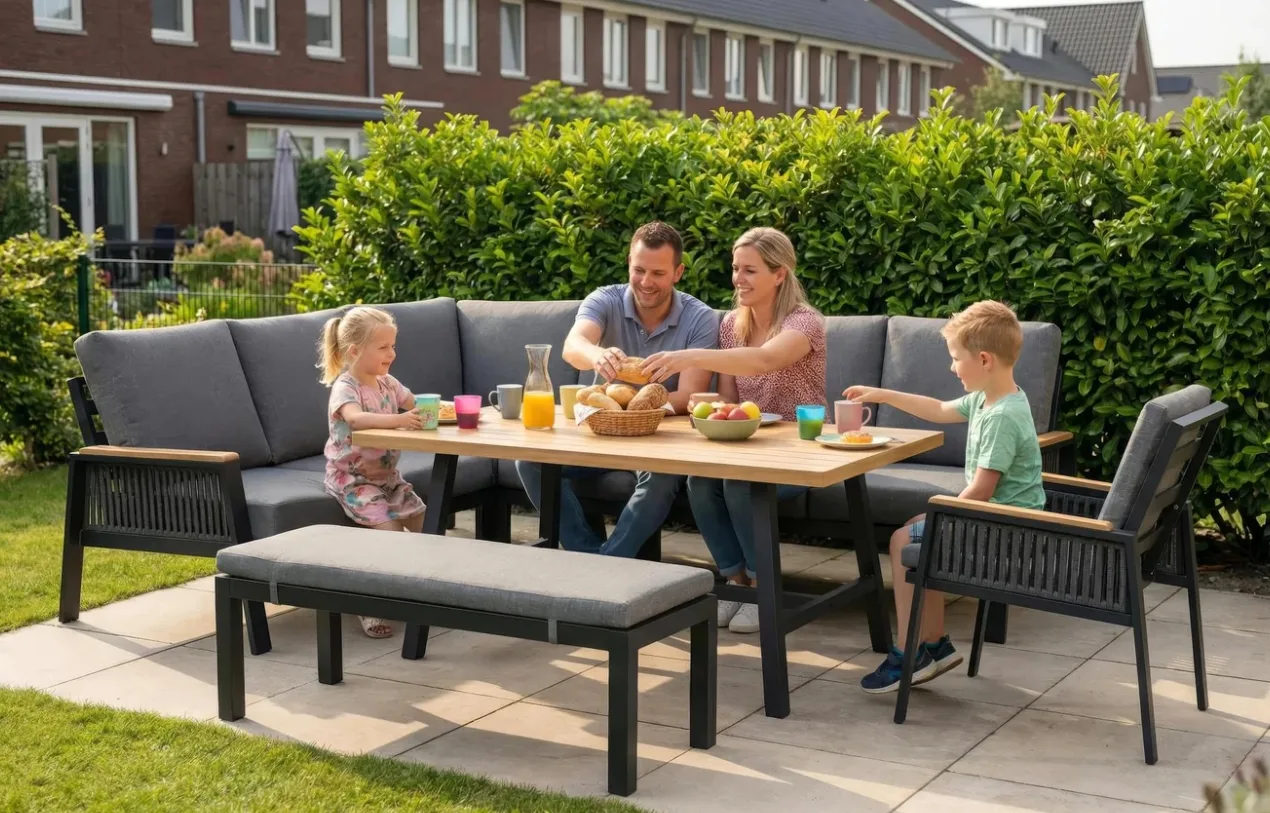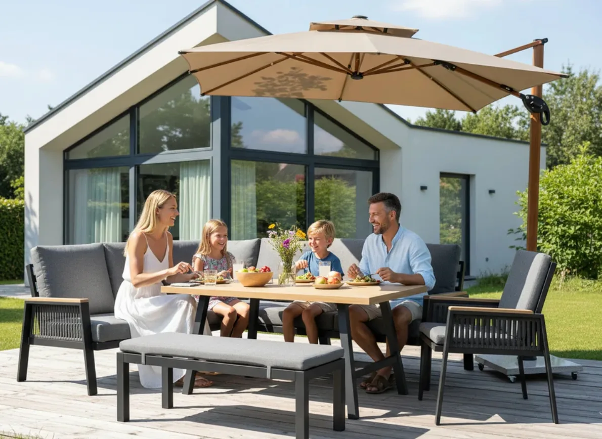 Ez az összeállítás kényelmes ülőhelyet biztosít több személy számára, így ideális családi étkezésekhez vagy baráti összejövetelekhez a szabadban.