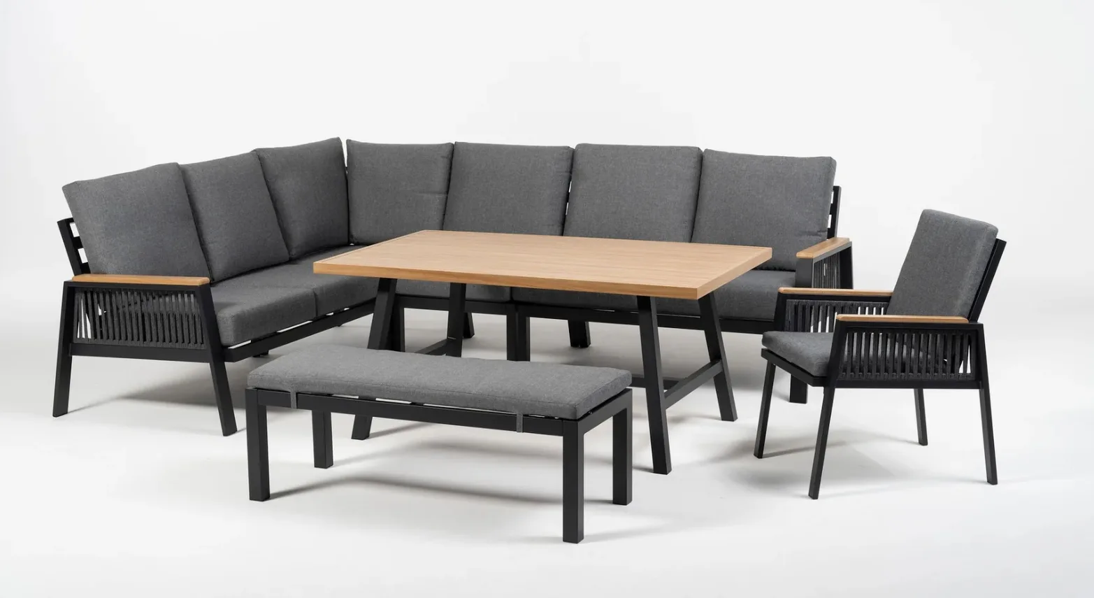 A garnitúra masszív fekete porfestett alumínium vázzal készül, amely ellenáll az időjárási hatásoknak és hosszú távon is megbízható kültéri használatot biztosít.