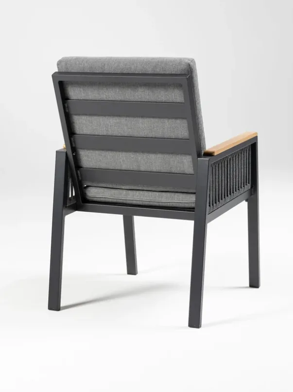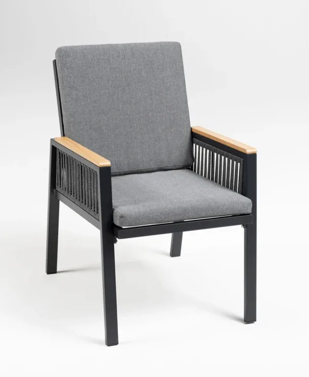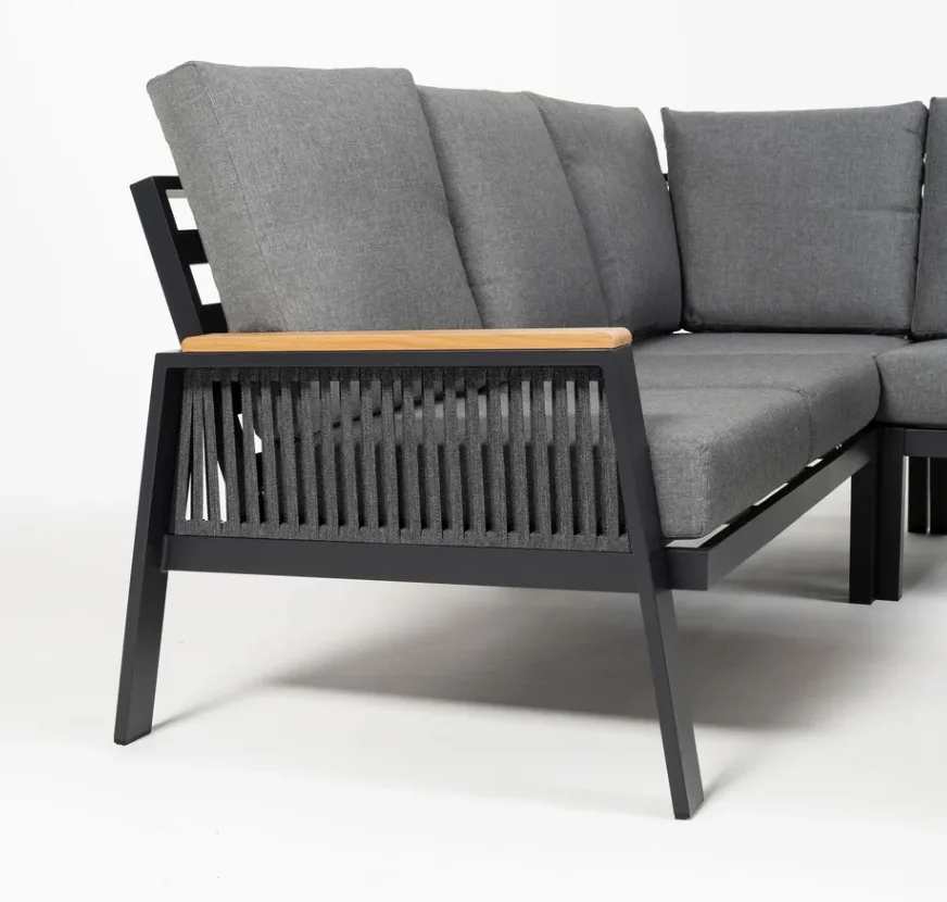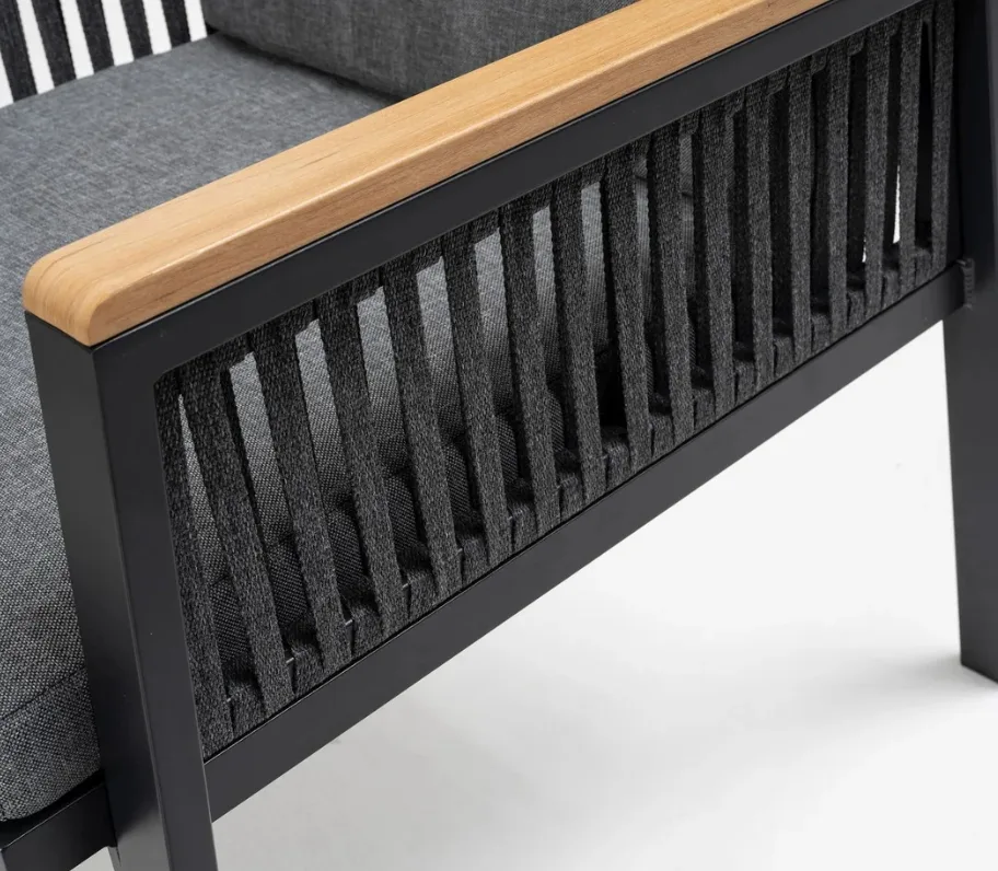 Az ülőfelületek sötétszürke fonott kialakítással készülnek, amely modern és légies megjelenést kölcsönöz a bútornak. A kényelmes ülő- és háttámlapárnák szürke színű, vízlepergető huzattal rendelkeznek, így a garnitúra kültéri használatra is ideális.