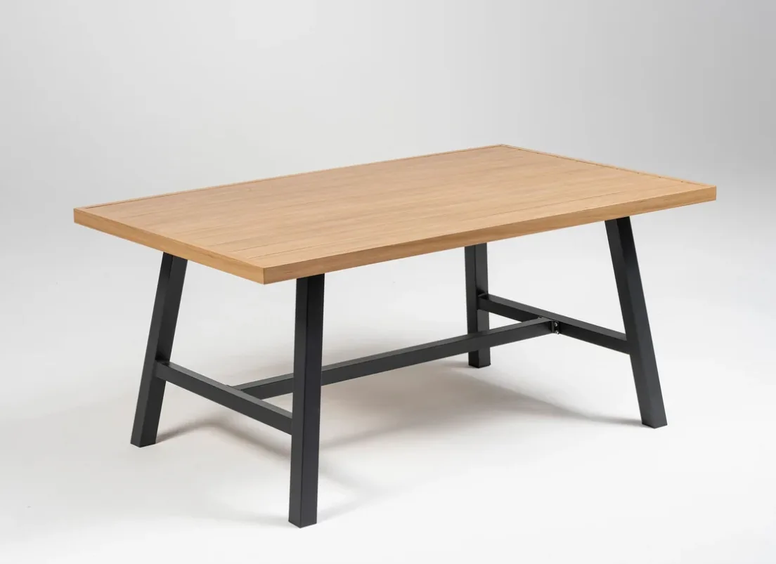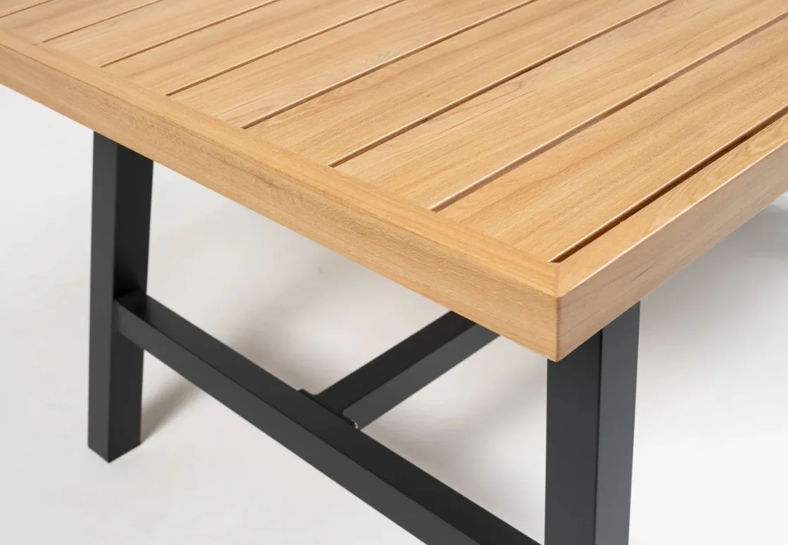 Az étkezőasztal alumínium asztallappal készül, amely fa hatású hőátviteles dekorral rendelkezik, így természetes megjelenést biztosít a kertben vagy a teraszon.