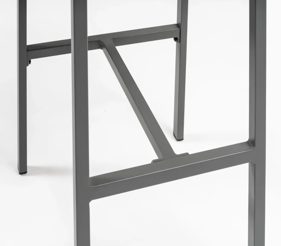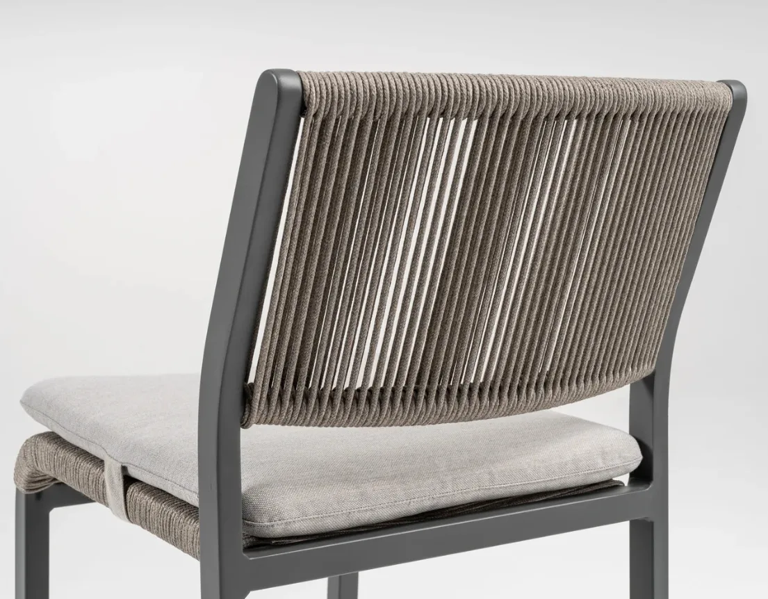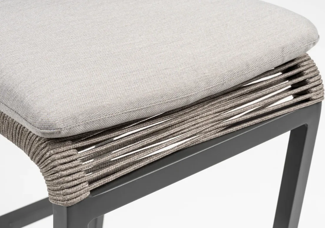 Az antracit színű alumínium váz és a szürke kötélfonatos ülő- és háttámla modern, légies összhatást biztosít. A világos szürke párna finom kontrasztot ad, így a bárszék egyszerre elegáns és jól kombinálható különböző kültéri környezetekben.