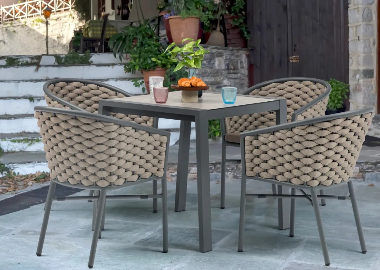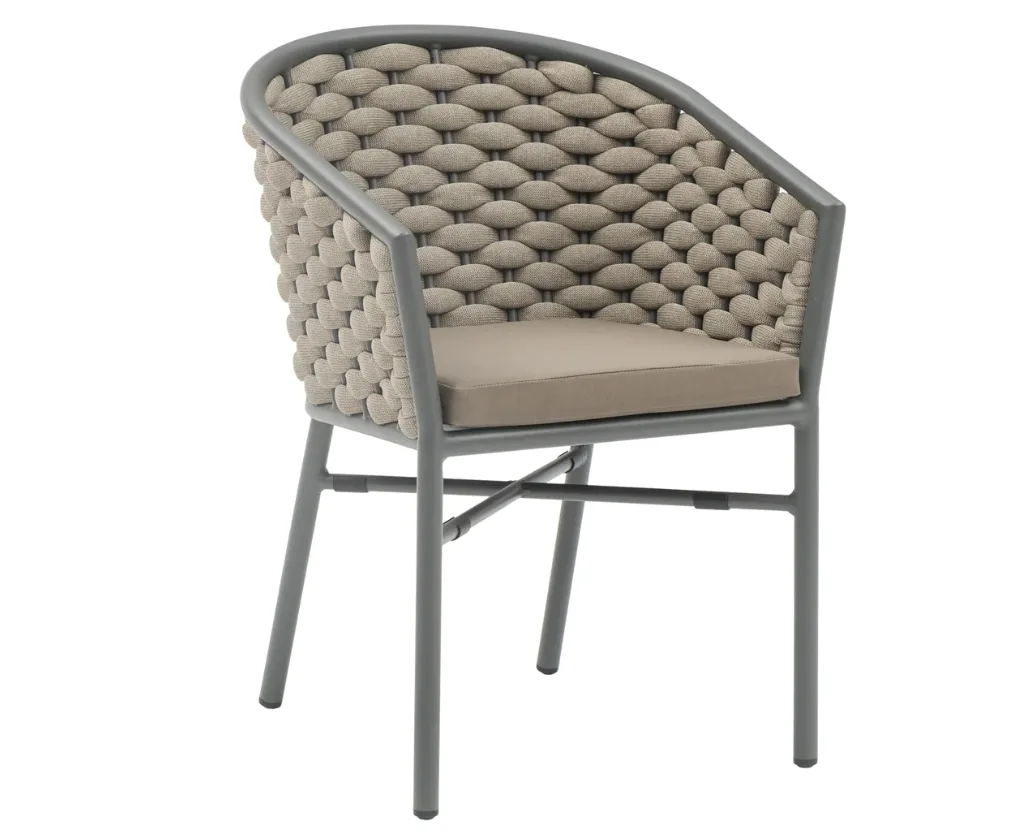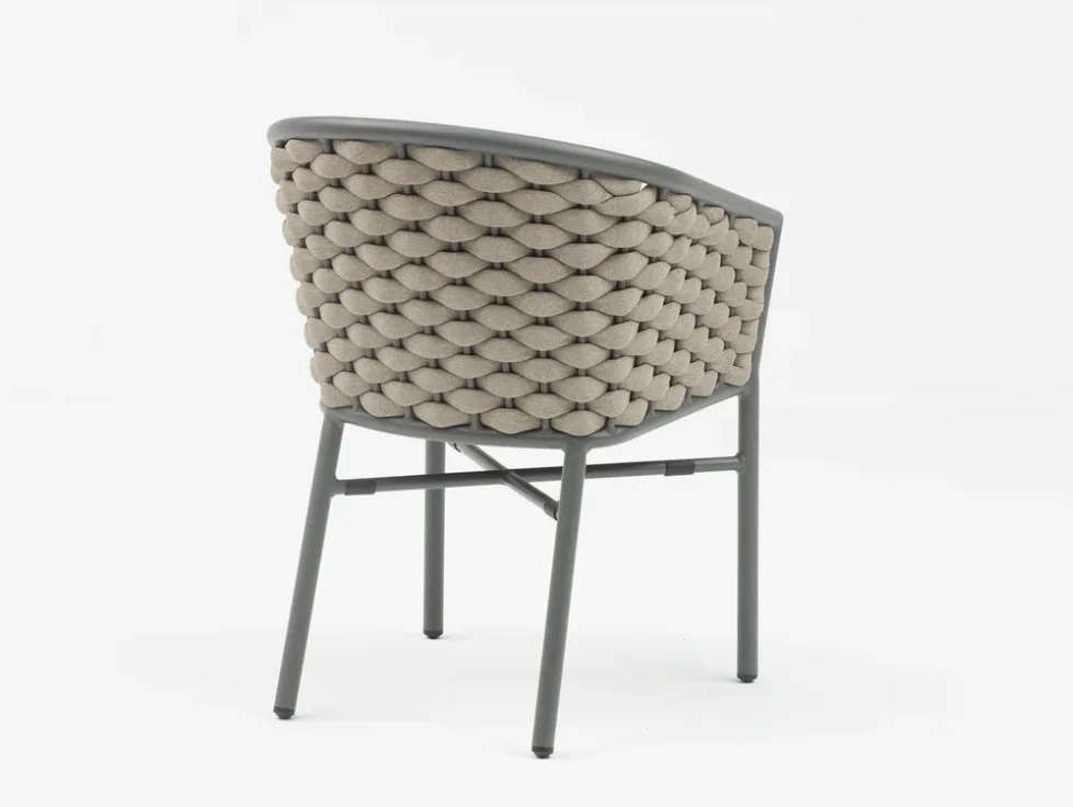 A Kréta szék különlegessége a kötélfonatos (rope) háttámla, amely légies, mégis markáns megjelenést biztosít. A finoman ívelt forma és a modern színkombinációk könnyedén illeszkednek különböző kültéri környezetekbe.