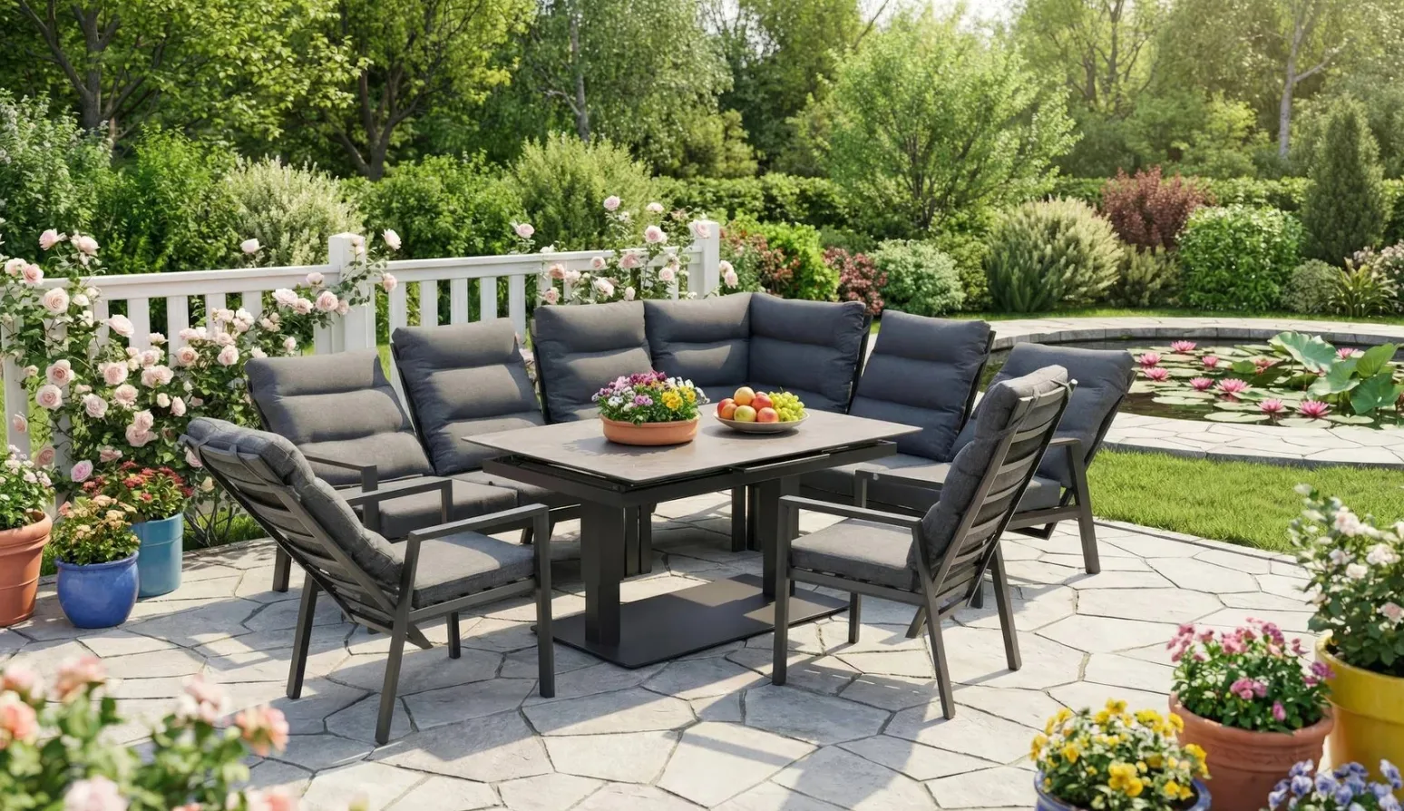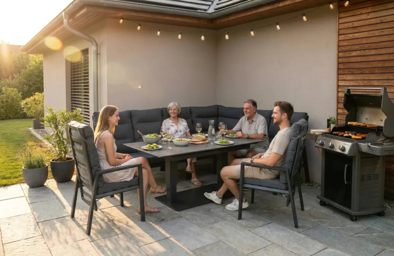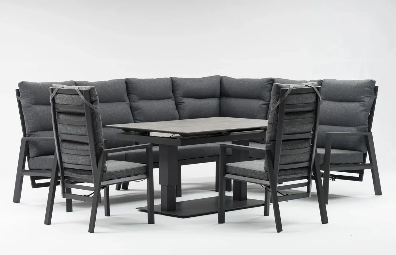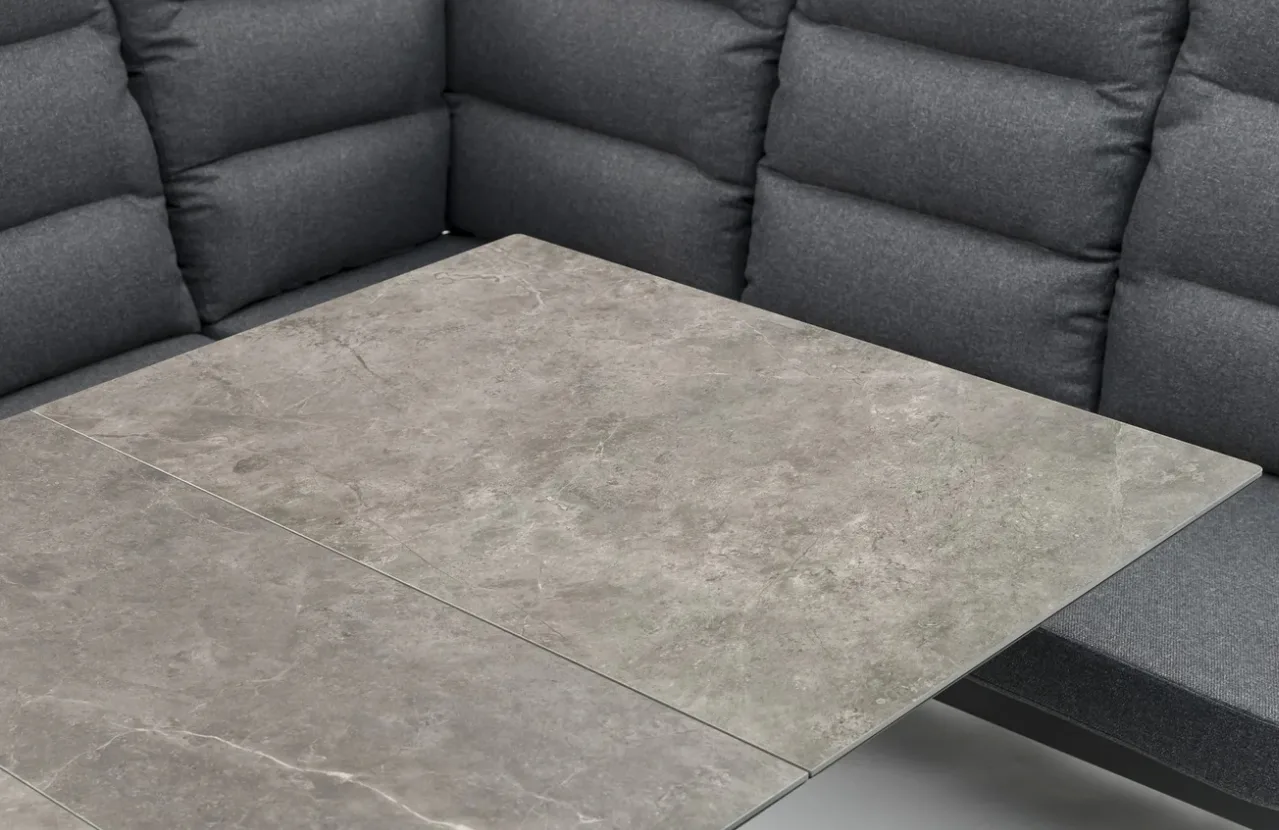 A szett egyik legnagyobb előnye a magasságállítható és bővíthető asztal, amely lehetővé teszi, hogy lounge és étkező funkció között válts: