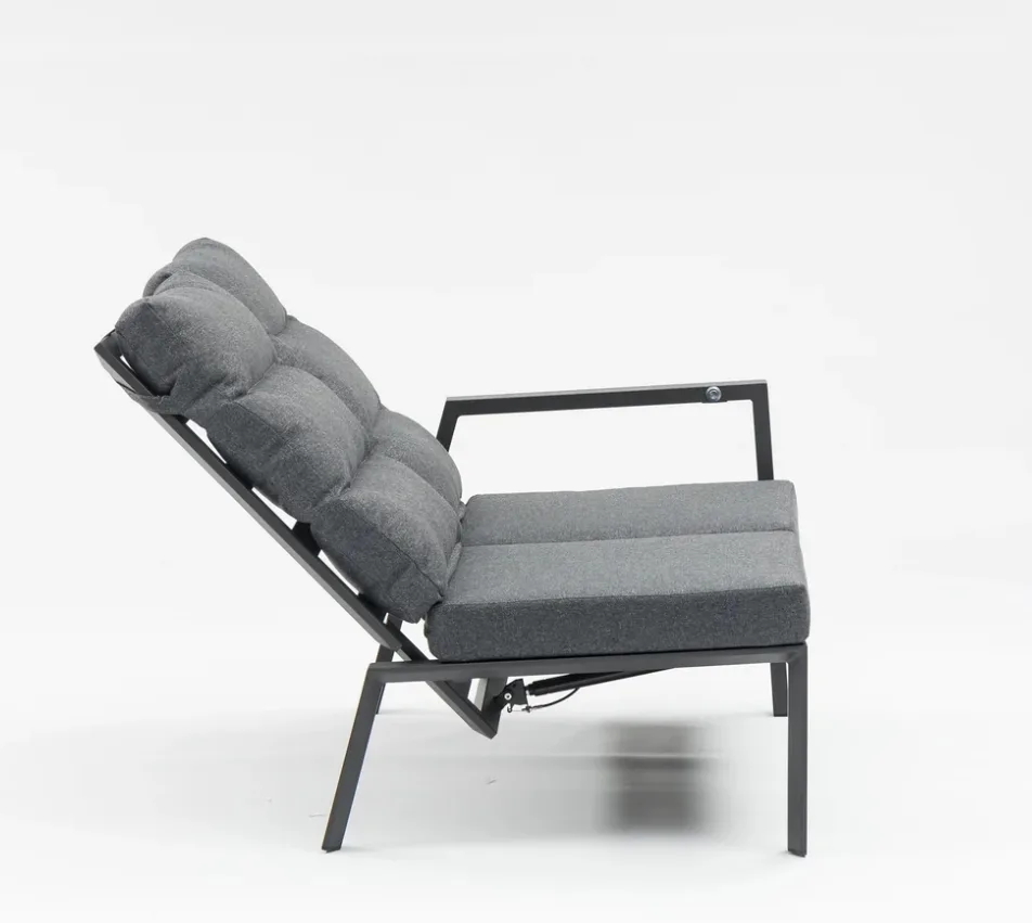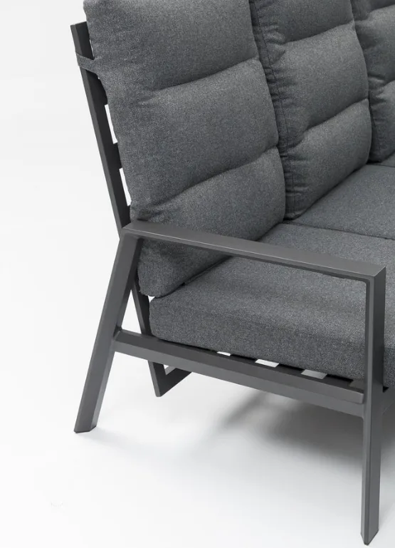 A sötét tónusú, antracit alumínium váz és a melírozott párnák elegáns, letisztult összhatást biztosítanak. A szett harmonikus, „tone-in-tone” megjelenése modern és időtálló, így bármilyen kültéri környezetbe könnyedén illeszkedik.