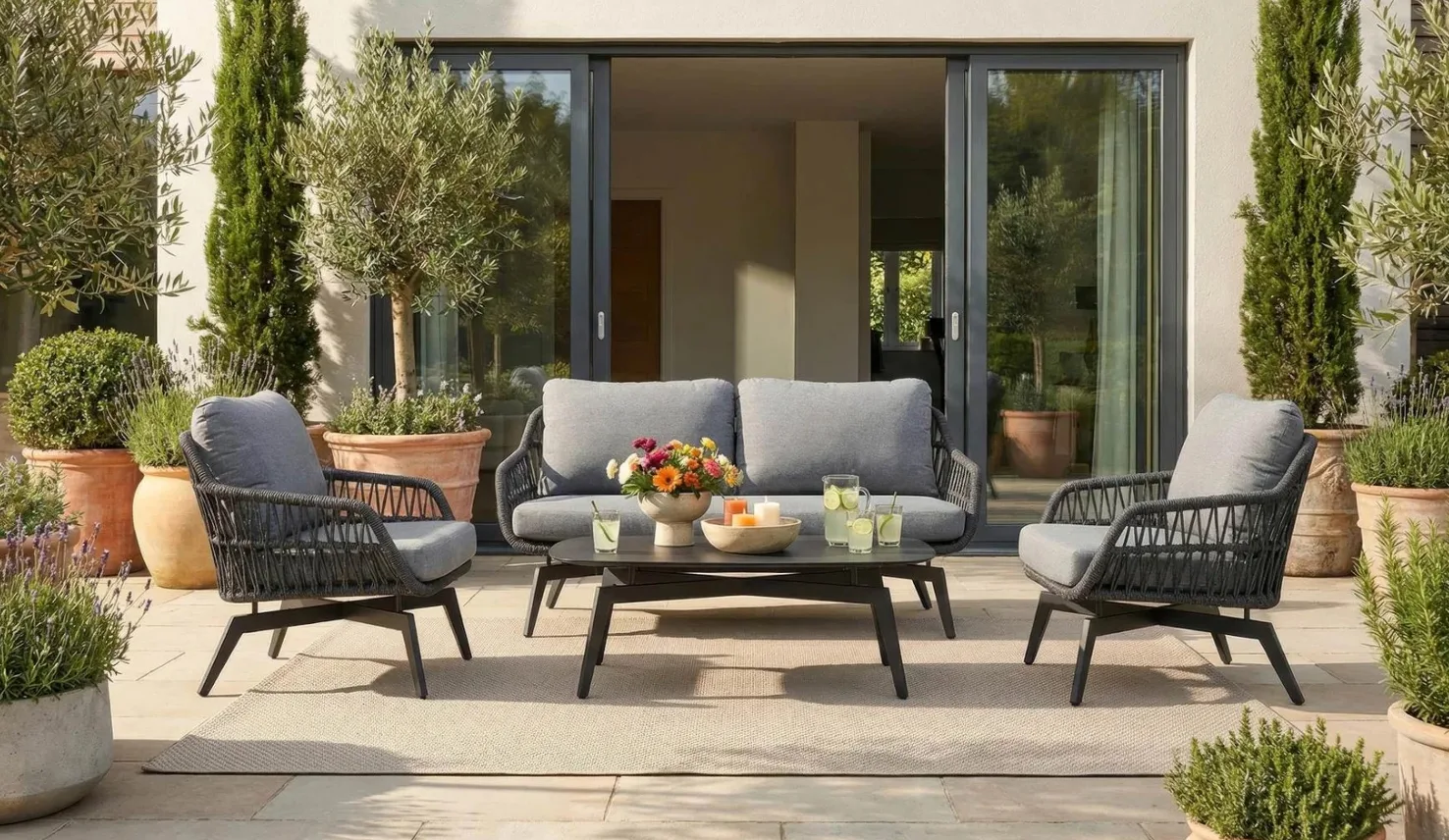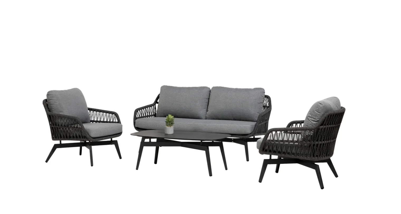 Modern és harmonikus design: a sötét tónusú textilszálas huzattal és alumínium vázzal a Sahara garnitúra bármely kültéri térben mutatós látványt nyújt.