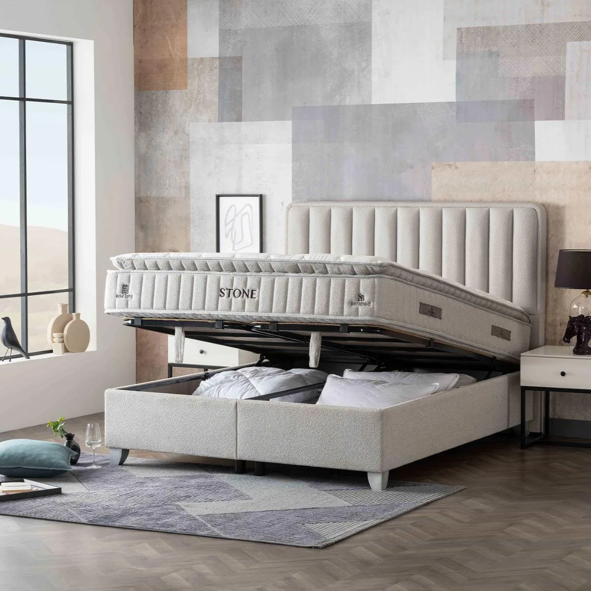 A Stone ágykeret a modern elegancia és a funkcionalitás harmonikus ötvözete, amely kiváló minőségű anyagokból készült, garantálva a tartósságot és a stabilitást. Letisztult vonalvezetése és időtálló dizájnja révén bármely hálószobában kifinomult megjelenést biztosít.